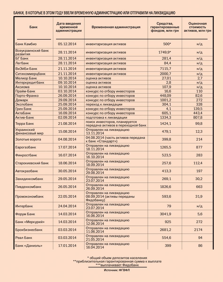 Общая гарантированная государством сумма депозитов по ликвидируемым банкам сейчас (без учета банка «Золотые ворота») составляет 15 млрд грн, а оценочная стоимость их активов — 10,5 млрд грн. Что касается оценочной стоимости активов банков, в которые сейчас введена временная администрация, то по десяти из них, согласно данным ФГВФЛ, она составляет 2,5 млрд грн. Но большая часть этих средств находится в залоге у Нацбанка под полученное рефинансирование, рассказал Кияк.
