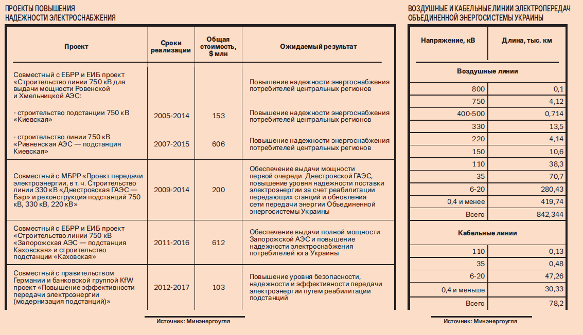 Государственная компания «Укрэнерго», являющаяся оператором магистральных электрических сетей, в последнее десятилетие начала несколько проектов, направленных на повышение надежности и безопасности энергоснабжения. В частности, начата реализация проекта по строительству линий электропередач, которые свяжут Ровенскую и Хмельницкую атомные электростанции с подстанцией «Киевская». Это должно повысить надежность энерго­снабжения центральных регио­нов Укра­ины. Также запланировано строительство аналогичной линии Запорожская АЭС — подстанция Каховская для повышения надежности энергоснабжения потребителей юга страны. Финансирование этих проектов осуществляется за счет кредитов Европейского банка реконструкции и развития, Всемирного банка и Европейского инвестиционного банка.
