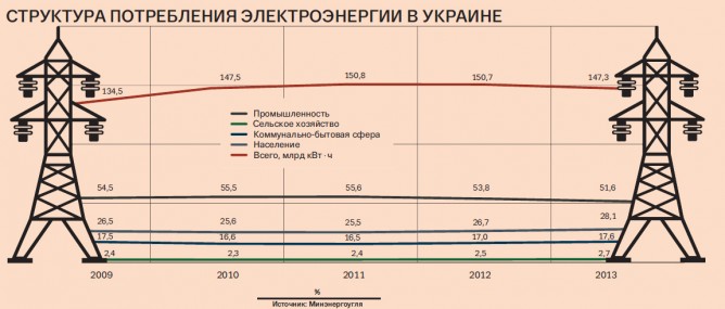 В то же время потребление электроэнергии на душу населения в нашей стране все еще отстает от европейского уровня. По данным International Energy Agency, в 2010 г. в Украине оно составило 3,5 тыс. кВт·ч, тогда как в Польше, например, — 3,8 тыс. кВт·ч, в Чехии — 6,3 тыс. кВт·ч, а в Бельгии — 8,4 тыс. кВт·ч (за последние годы ситуация практически не изменилась: с 2011 г. производство и потребление электроэнергии в Украине не увеличивалось). При этом использование электроэнергии одним из основных потребителей — населением — неуклонно возрастает.