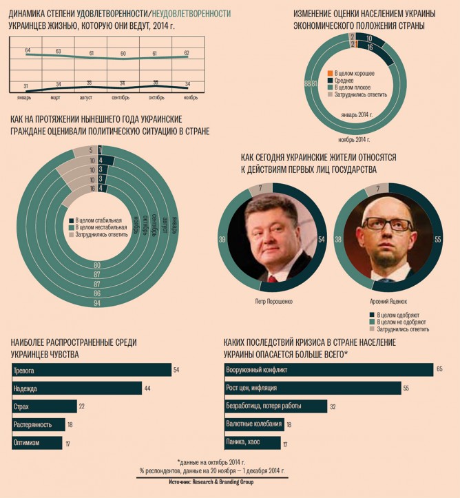 С начала 2014 г. степень удовлетворенности украинцами собственной жизнью осталась практически неизменной: по состоянию «на сейчас» лишь чуть больше трети соотечественников — 34 % — удовлетворены уровнем жизни (против 32 % в январе). Не высказывают удовлетворения 62 % граждан (против 64 % в начале года). Таковы результаты исследования «Общественно-политическая ситуация в Украине», проводившегося с 20 ноября по 1 декабря исследовательской компанией Research & Branding Group. Предметом для анализа послужили итоги опроса более 2 тыс. совершеннолетних граждан Украины, проводившегося по всей материковой территории страны за вычетом Донецкой и Луганской областей. Цель исследования — проанализировать отношение украинской общественности к текущей социально-политической обстановке и к действиям политических лидеров страны, а также выявить наиболее характерные для населения Украины чувства и опасения.