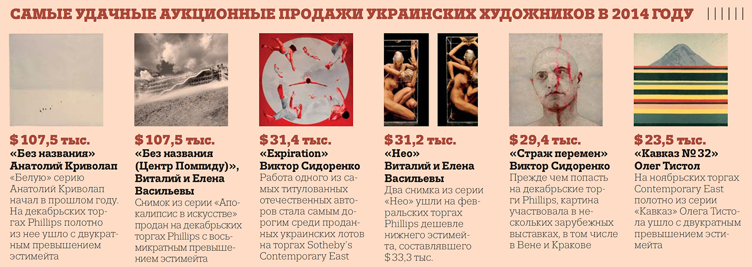 В 2014 году с украинскими художниками активнее всего сотрудничал аукционный дом Phillips. На дневных торгах современным искусством в феврале были выставлены и проданы два лота: картина Виктора Сидоренко «Без названия» из серии «Отражение в неизвестном» за £20 тыс. и фотографический диптих из серии «Нео» Виталия и Елены Васильевых за £18,7 тыс. Затем в апреле на торгах «Under the influence» с молотка ушли два из трех представленных украинских лота: скульптурная инсталляция Назара Билыка «Appearance» за £5 тыс. и рисунок Романа Минина «Награда за молчание» за £3,1 тыс. Оба автора входят в число самых перспективных отечественных молодых художников, и продажа их работ — свидетельство растущего интереса зарубежных коллекционеров именно к молодому украинскому арту. Тенденцию закрепила продажа произведений Минина и Билыка на прошедших 25 ноября торгах Contemporary East аукционного дома Sotheby’s. А затем и на декабрьских «Under the influence», где были проданы работы Минина и еще одного молодого автора Михаила Деяка. Успехом работы Романа Минина пользовались и на арт-ярмарке Scope, которая прошла в Майами 2‑7 декабря и на которой украинский стенд был представлен впервые. Арт-дилер Игорь Абрамович рассказал «Капиталу», что продал американским коллекционерам три картины художника по цене от $ 1,2 тыс. до $ 5 тыс.