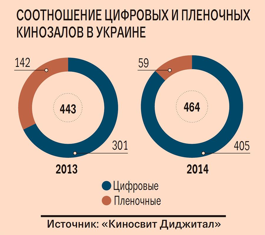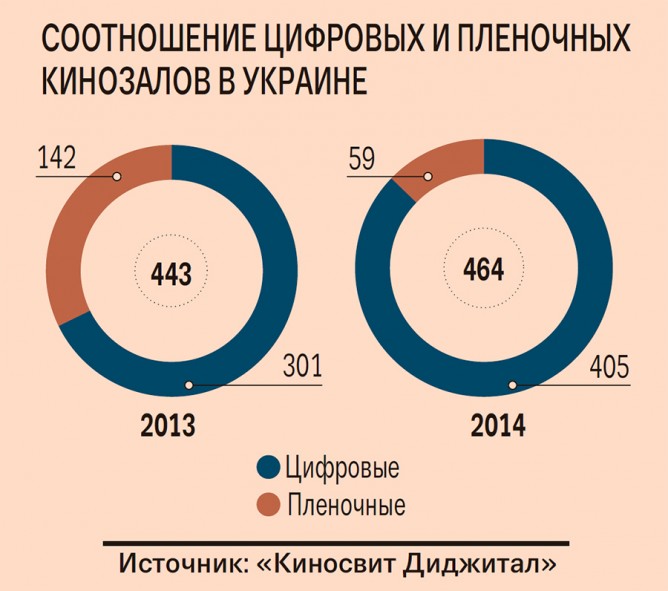 Выражение «что крутят в кинотеатре» теряет фактический смысл. На конец 2014 г. в Украине осталось всего 59 кинозалов, демонстрирующих фильмы на пленке (12,7 % от общего количества). Тогда как еще в прошлом году «пленочных» залов в нашей стране было более 140. Соответствующими данными компании «Киносвит Диджитал» (обслуживает кинозалы) располагает «Капитал». При этом число цифровых кинозалов в Украине увеличилось на 104 и достигло 405.