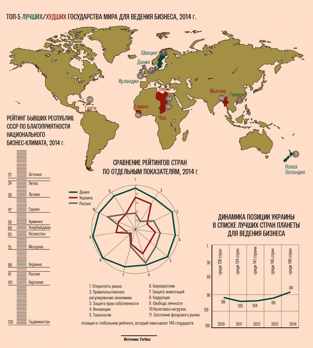 В нынешнем году по качеству бизнес-климата Украина оказалась 88‑й из 146 государств, расположившись в глобальном листинге между Тунисом и Шри-Ланкой. Эти показатели зафиксированы девятым ежегодным рейтингом «Лучшие страны для ведения бизнеса 2014», подготовленным авторитетным американским изданием Forbes. Информацией для анализа послужили результаты исследований таких влиятельных международных организаций, как Всемирный экономический форум, Всемирный банк, Transparency International и другие.