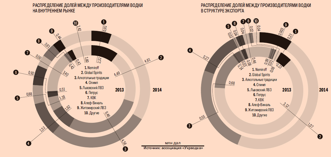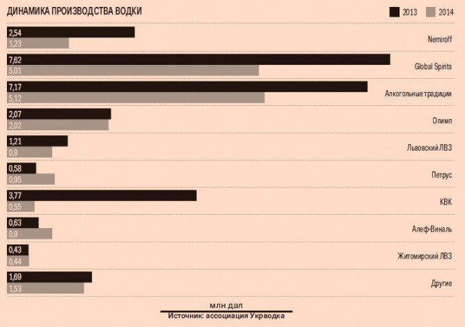 Рост цен на спиртное снизил спрос. По итогам года, согласно прогнозам отраслевых ассоциаций, рынок алкоголя во всех сегментах может показать рекордное падение в 20 %. Но нельзя сбрасывать со счетов и сужение рынка из‑за аннексии Крыма и боевых действий на востоке Украины. «Вести цивилизованную торговлю в сложившихся условиях [на востоке] невозможно», — сетует Колесниченко.