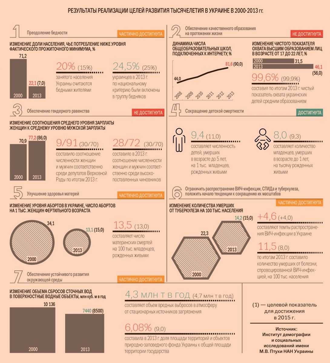 Согласно оценкам научных экспертов, из шести оставшихся ЦРТ в 2013 г. Украина частично реализовала четыре, уже достигнув запланированных показателей по отдельным индикаторам. Так, в начале тысячелетия украинские лидеры собирались до 2015 г. сократить долю бедных украинцев до четверти населения, тогда как на конец прошлого года их численность составляла 24,5 %. С 2000 г. в Украине более чем вдвое — до 13,1 на 1 тыс. женщин фертильного возраста — сократился уровень абортов, уже превзойдя желаемый показатель. Превысить собственные ожидания Украине удалось также в сокращении уровня смертности от туберкулеза, а также снижении объемов вредных выбросов в атмосферу и сбросов сточных вод. С другой стороны, украинское правительство пока предпринимает недостаточно усилий для реализации возложенных на себя обязательств по обеспечению населения качественным образованием и гендерному равенству. Так, настоящим вызовом для Украины по‑прежнему остается распределение между мужчинами и женщинами депутатских мандатов, в процентном выражении составляющее 91 на 9 (против 70 на 30 до 2015 г.).