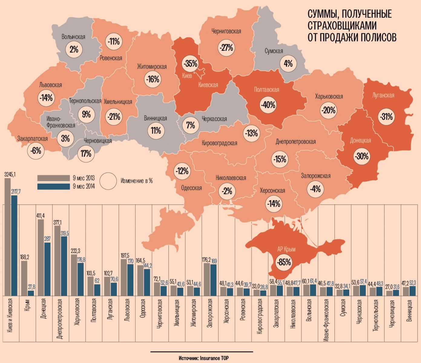 Кроме полуострова, большой провал по сбору премий показали Донецкая (падение на 30 %) и Луганская (на 31 %) области. «Если посмотреть на динамику страхования за три квартала 2014 г., можно увидеть постепенное сокращение объемов в Донецкой и Луганской областях в связи с началом АТО. А в Крыму после аннексии страховщики вообще закрыли свой бизнес», — подтвердила пресс-служба СК «АХА Страхование».