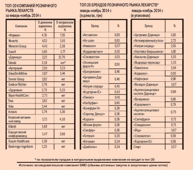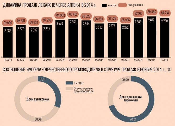 Уходящий год фармацевты провожают в растерянных чувствах. По итогам января-ноября 2014 г. розничные продажи лекарств выросли по сравнению с аналогичным периодом 2013 г. на 24 % — до 27,3 млрд грн, свидетельствуют данные исследовательской компании SMD. Подорожавшие лекарства отпугнули покупателей: с начала года продажи в упаковках снизились на 1,4 %, до 1 млрд шт. «Отечественный рынок по уровню потребления находится на уровне показателей 2007 г. Фактически он откатился на семь лет назад», — жалуется директор фармкомпании «Такеда Украина» Евгений Заика.