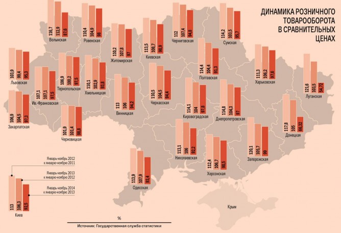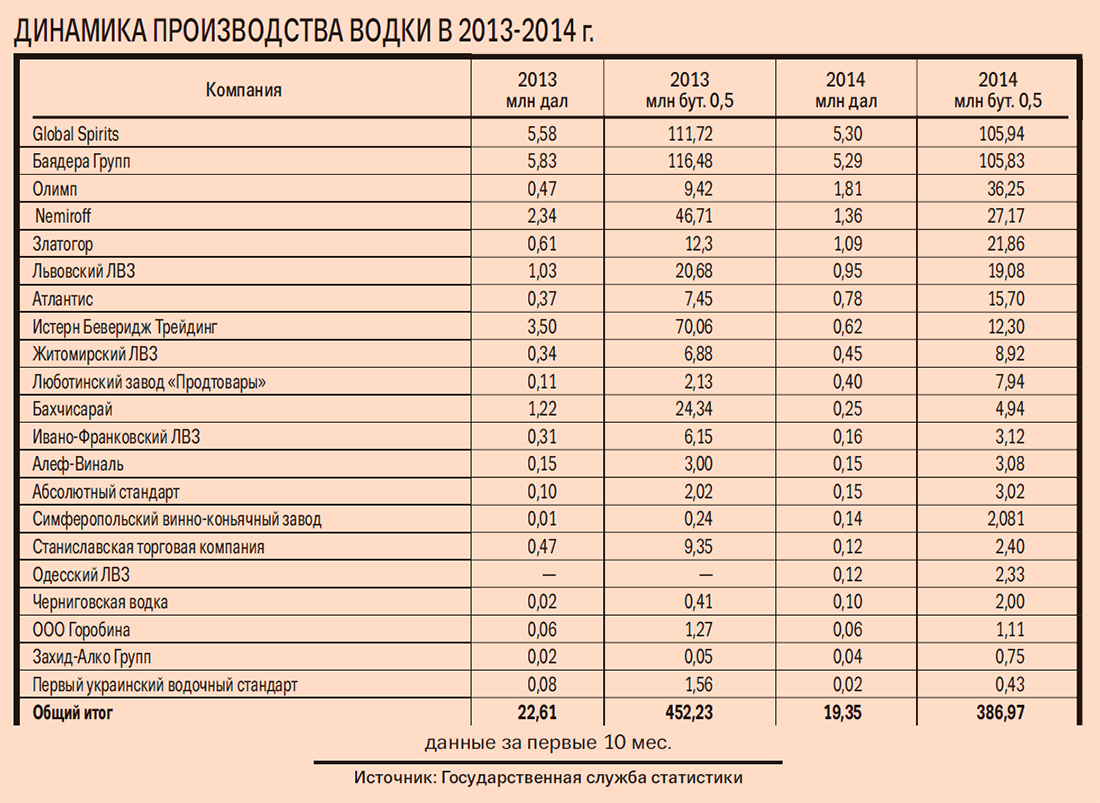 Пессимистичные тенденции подтверждают и производители. Например, по словам коммерческого директора украинской алкогольной компании «Олимп» Яна Максимовского, в декабре в натуральном выражении продажи упали на 12 % по сравнению с предновогодним периодом 2013 г. «Маржинальность бизнеса снизилась, поскольку цены на комплектующие (колпачки, этикетки, элементы стеклотары) растут с каждым днем из‑за девальвации гривни», — добавил собеседник издания.
