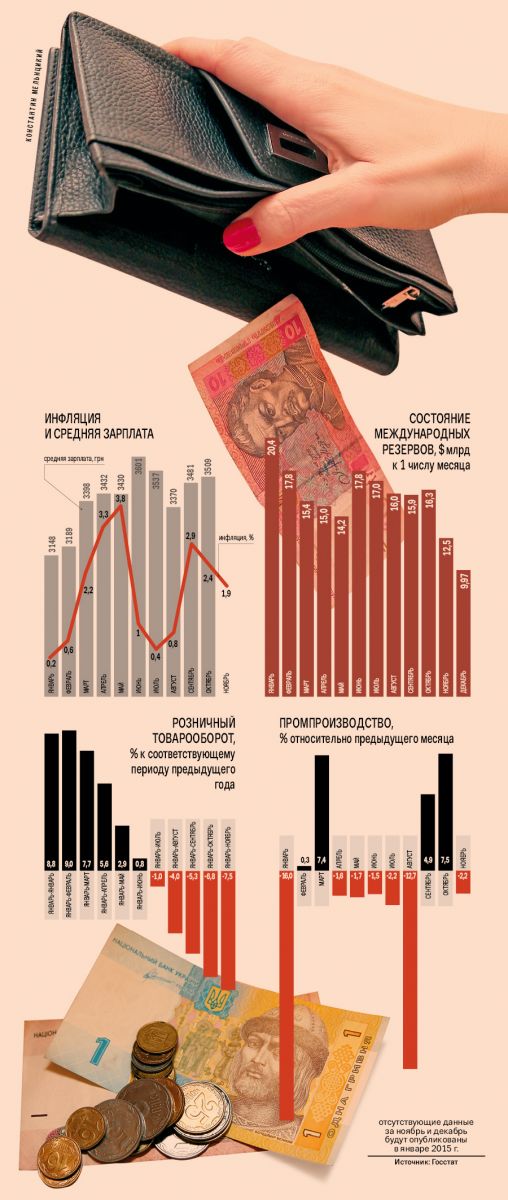 В этом году на фоне падающей гривни дорожало практически все — от продуктов питания до промышленной продукции. За 11 месяцев потребительские цены в стране взлетели на 21,2 %, тем самым почти догнав уровень инфляции пятилетней давности. В начале января, когда Государственная служба статистики обнародует данные за весь прошлый год, итоговое значение этого показателя может и вовсе обновить рекорд. По прогнозу председателя Национального банка Валерии Гонтаревой, инфляция может составить 25 %.Дорожал в этом году не только импорт. Украинские производители, использующие импортные комплектующие и сырье, также вынуждены были повышать цены. Росла стоимость и аграрной продукции из‑за подорожания топлива.