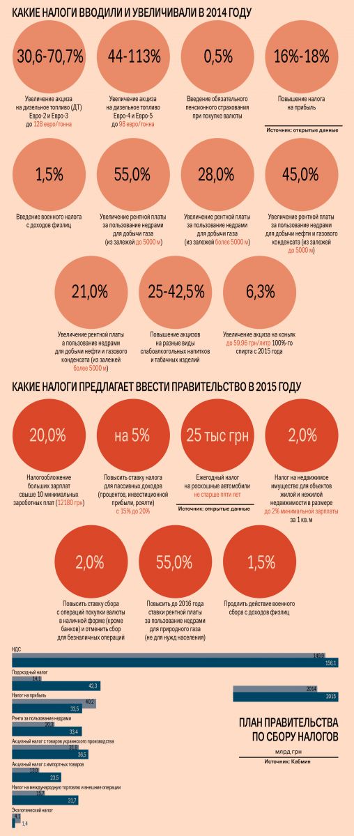В этом году Верховная Рада с подачи правительства дважды вносила изменения в Налоговый кодекс (НК). Сначала в марте, когда премьер-министр Арсений Яценюк, пугая народных депутатов возможным дефолтом, настоял на принятии антикризисного законопроекта, подготовленного правительством. На тот момент фискальный разрыв, с которым требовалось справиться Кабинету министров, по оценкам Яценюка, составлял порядка 289 млрд грн. Деньги необходимо было искать быстро, не откладывая непопулярные инициативы на потом. В правительстве не придумали ничего лучше, чем взять больше обычного с бизнеса. «Или решения будут приняты, или Украина станет страной-банкротом и будет объявлен дефолт. Всего два варианта», — стоял на своем премьер. Вместе с налогами Рада тогда повысила акцизы на сигареты и спиртное, а также на дизельное топливо. Но это было только началом «реформ».