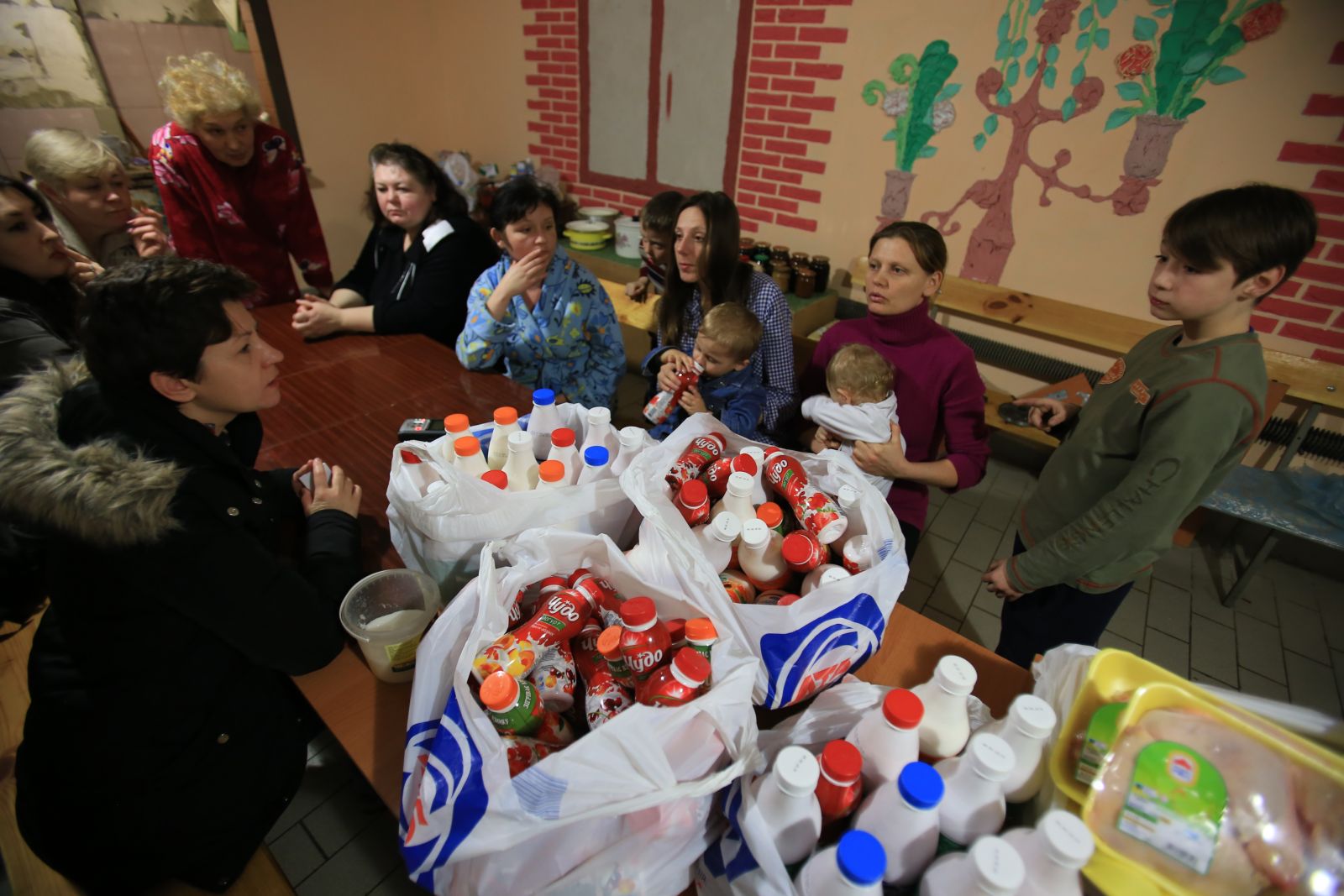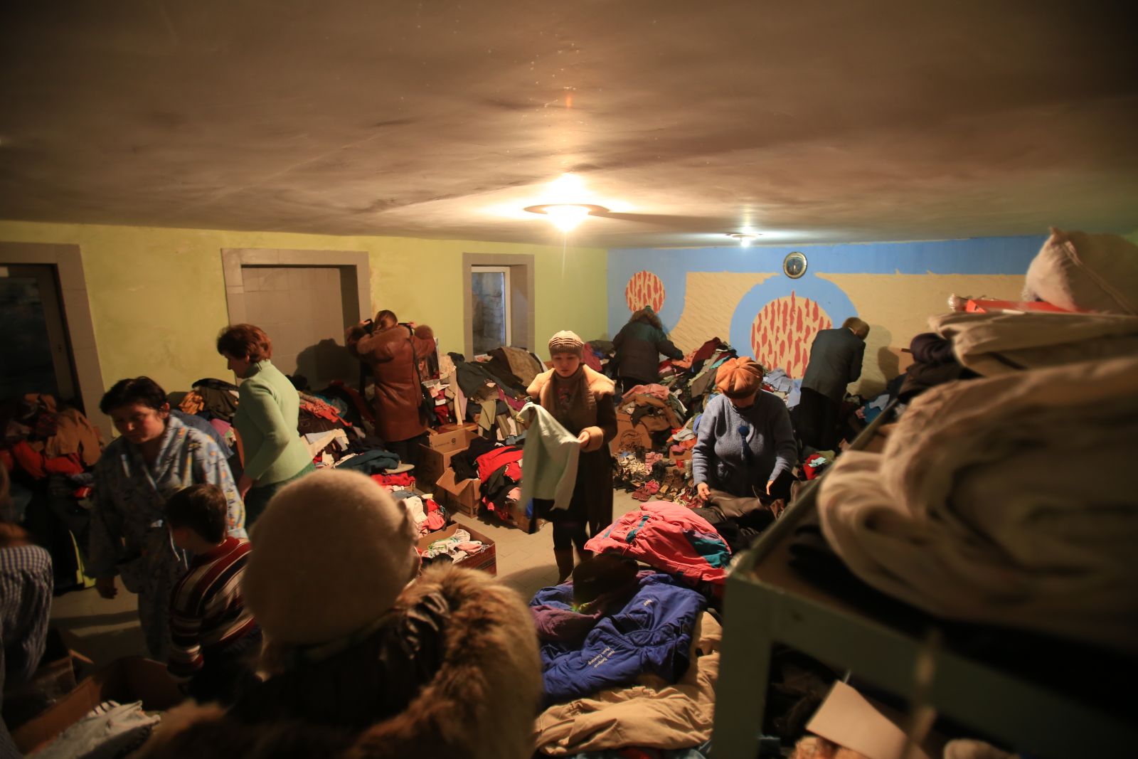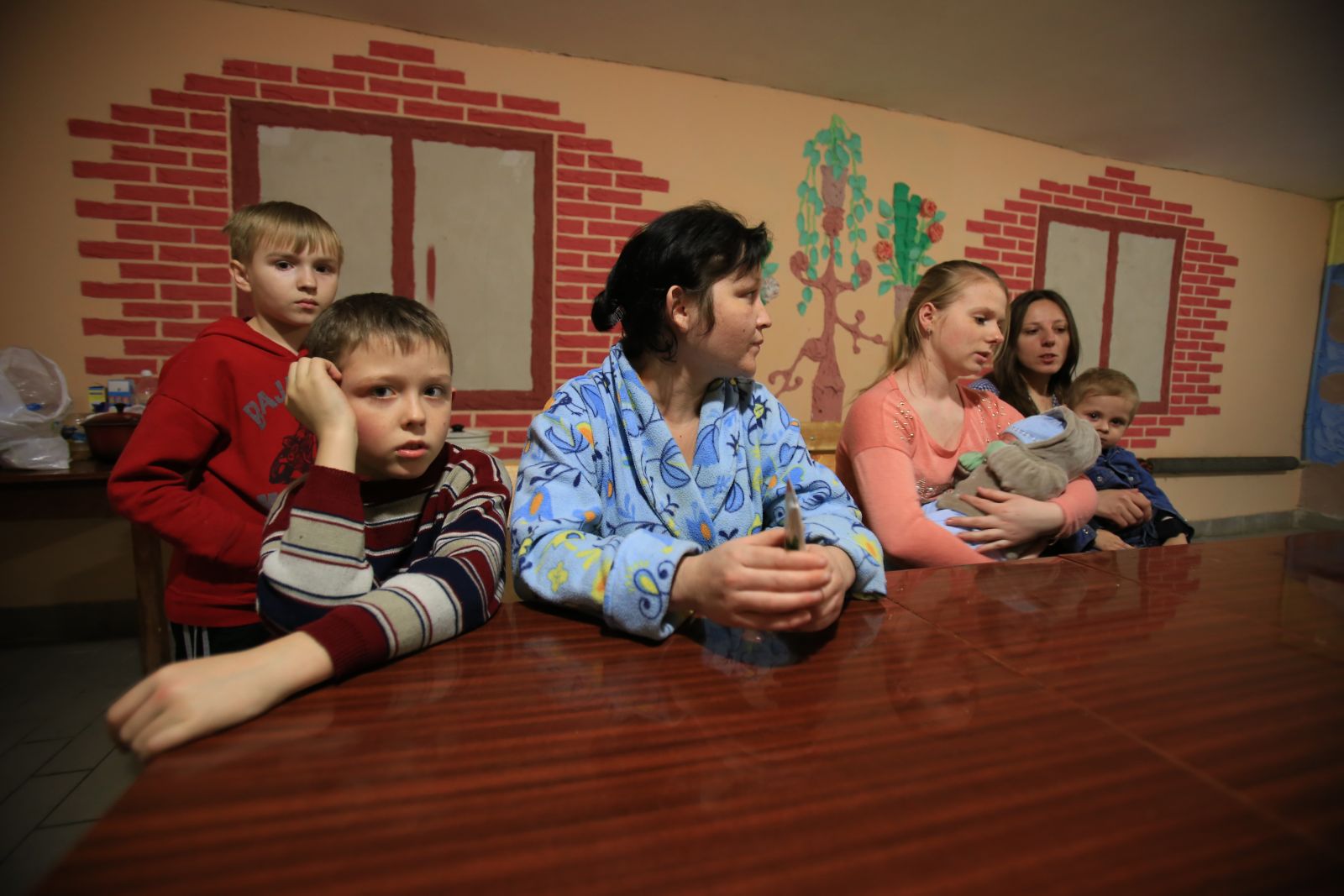 В этом доме местная христианская церковь пятидесятников устроила базу для беженцев. Сейчас там постоянно проживают 45 человек, из которых 23 — дети. Самому младшему — всего месяц. Самому старшему — 92 года. И тот и другой в силу своего возраста и к счастью для них не понимают, что оказались в эпицентре военных действий. Старик почти слепой и глухой, говорит его невестка Марина, для него стрессом была вовсе не война (когда-то они жили в Песках, потом — в Водяном), а то, что его увезли из дома. «Первые дни он наотрез отказывался снимать пальто, в шапке сидел, проверял, на месте ли ботинки, чтобы быстро собраться», — говорит Марина. Сейчас немного успокоился, но так до конца и не осознал, что же случилось.