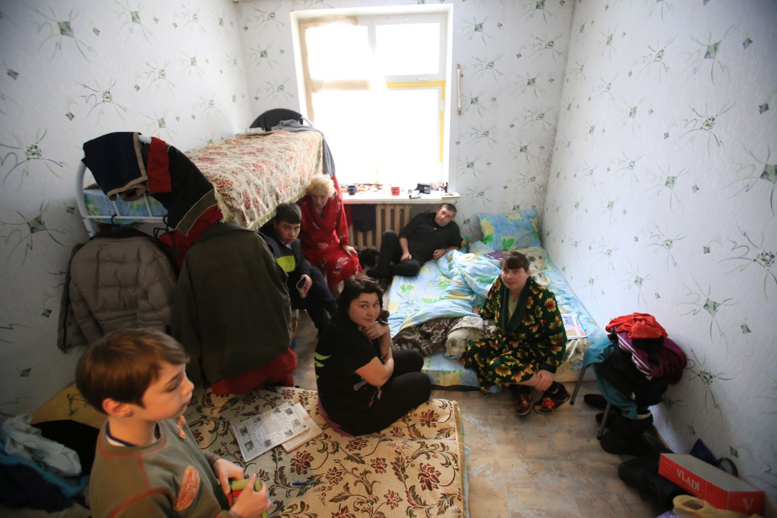 В комнатах теснятся по 2-3 семьи переселенцев, многие после подвальной жизни начинают болеть и шутят, что организм был намного крепче, когда они сидели под обстрелами