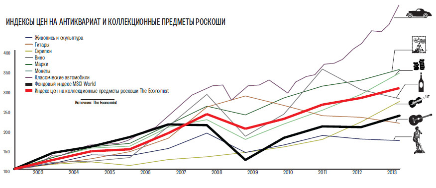 За последнее десятилетие цены на большинство видов коллекционных предметов выросли сильнее, чем фондовый индекс Morgan Stanley Capital International World, который учитывает стоимость акций более 1600 крупнейших компаний мира.