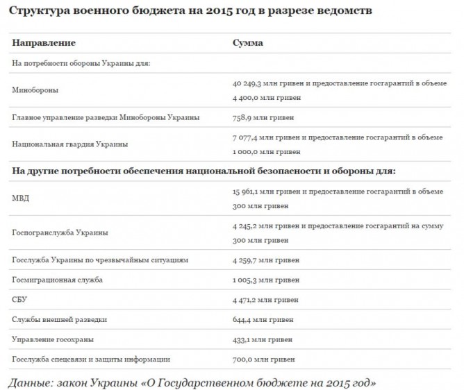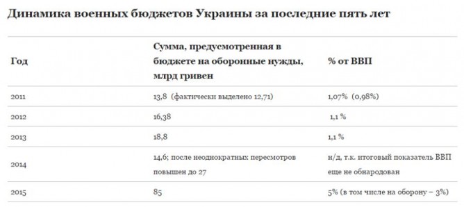 В госбюджете-2015 на укрепление обороноспособности Украины предусмотрены рекордные 86 млрд гривен, или 5% ВВП. Это беспрецедентная сумма, превышающая показатель прошлого года в 3 раза, и в 4-6 раз — оборонные бюджеты последних лет довоенного периода.