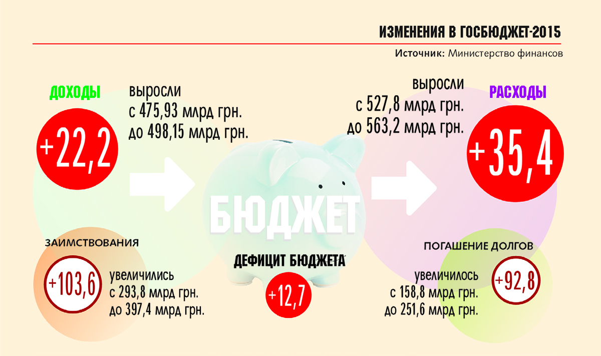 Обновленная смета предполагает рост расходов на 35,4 млрд грн. Тратить больше планируют на социальную сферу: жилищные субсидии, компенсации переселенцам из Донбасса. Но главное, с учетом нового обменного курса Минфину придется нарастить расходы на погашение госдолга на 92,7 млрд грн., а на его обслуживание — на 18 млрд грн.