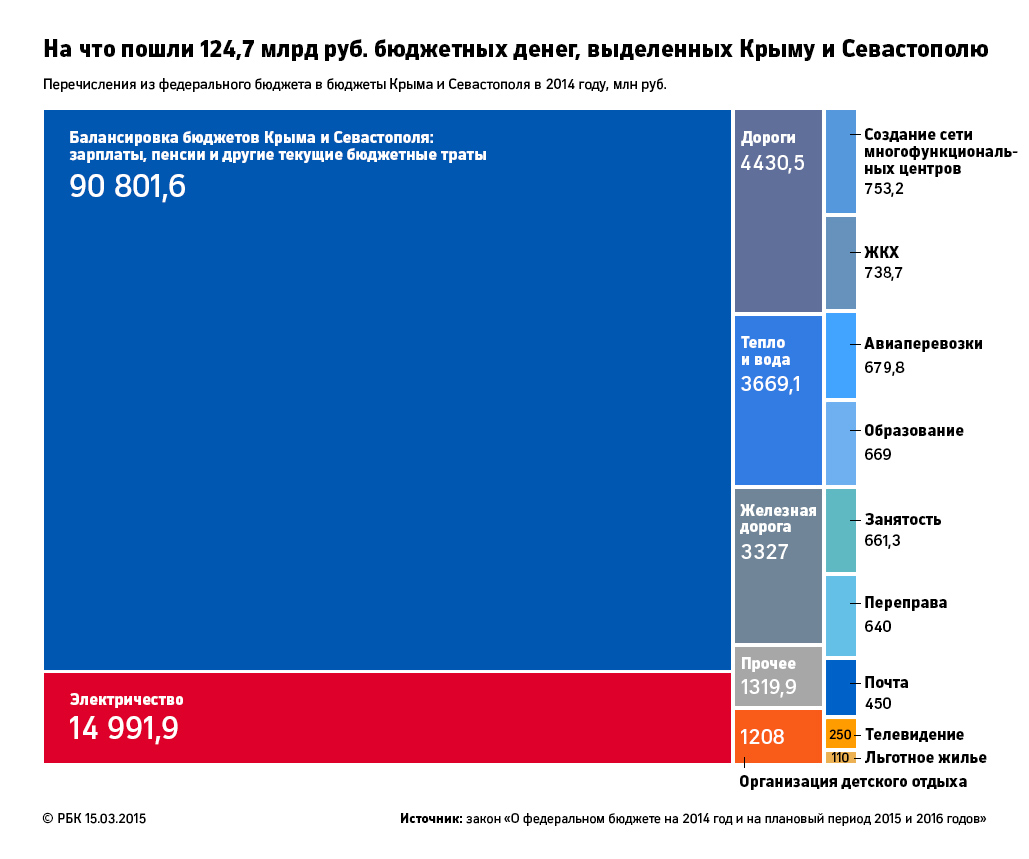 В итоге первые оценки оказались недалеки от фактически потраченных сумм. Финансовая поддержка Крыму и Севастополю с учетом дотаций на балансировку их бюджетов составила 90,8 млрд руб., целевые трансферты из федерального бюджета — еще 33,9 млрд руб., всего 124,7 млрд руб., сообщил представитель Минфина.