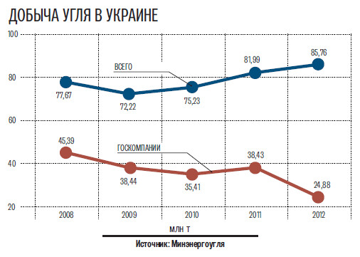 В 2012 г. Минфин подсчитал, что приватизация шахт или передача их в концессию может сократить дотации до 9,9 млрд грн в 2013 г. Однако активной приватизации не последовало, и уже в июле Верховная Рада увеличила размер господдержки угольных предприятий в 2013 г. на 5,5 млрд грн — до 13,3 млрд грн, что является рекордом.