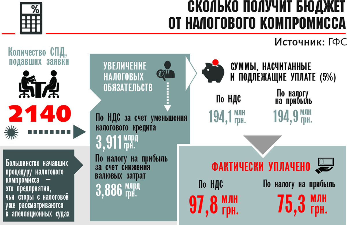 По данным Государственной фискальной службы (ГФС), по состоянию на 25 марта пойти на компромисс решили 2140 налогоплательщиков. Суммарно они должны перечислить в бюджет почти 389 млн грн. (компании увеличили размер своих налоговых обязательств на 7,78 млрд грн.). Из них госказна уже получила более 173 млн грн. Хотя отставленный глава фискальной службы Игорь Билоус рассчитывал привлечь 1-3 млрд грн.