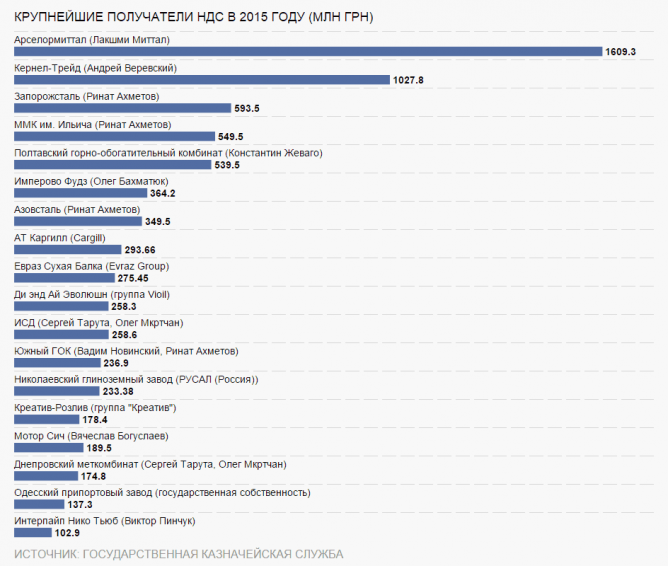 Государственная казначейская служба обнародовала отчет, из которого следует, что в этом году структура крупнейших получателей НДС несколько изменилась. Главным образом обделили промышленников, что не удивительно ввиду затяжного падения объемов производства. Например, если в прошлом году мариупольский меткомбинат им. Ильича, входящий в холдинг «Метинвест» Рината Ахметова, был в лидерах по возмещению, то в текущем году компания последний раз в январе получила почти 550 млн грн. По словам генерального директора ММК им. Ильича Юрия Зинченко, это удалось после продолжительных переговоров с правительством. «Государство начало возмещать меткомбинату НДС, но пока покрываются старые долги, за это время успевает вырасти задолженность за новый период, и это не дает решить проблему нехватки оборотных средств», — ранее заявил Зинченко.