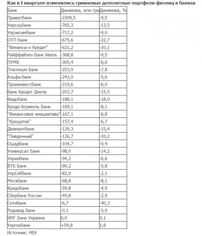 Вкладчики не доверяют банковской системе, поэтому в I квартале продолжали забирать деньги со счетов как крупнейших, так и крупных банков. И хотя гривневый портфель удалось нарастить хотя бы одному из них, валютные депозиты население забирало из всех учреждений. В условиях паники в лидерах антидоверия оказались и государственные банки, и «дочки» некоторых европейских групп.