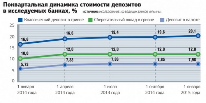 По данным исследования «50 ведущих банков Украины», среднегодовая ставка по классическому трехмесячному депозиту в гривне без права пополнения и досрочного снятия составила 18,93% годовых. При этом за 2014 год средняя доходность увеличилась на 3,5 п.п. — с 16,66% годовых до 20%. Минимальная доходность, которую декларировали банки, составила 8% годовых, максимальная — 24,5%. По сберегательным вкладам со свободным доступом к средствам средняя ставка возросла с 10% до 12% годовых. Доходность колеблется в диапазоне от 5% до 21%.