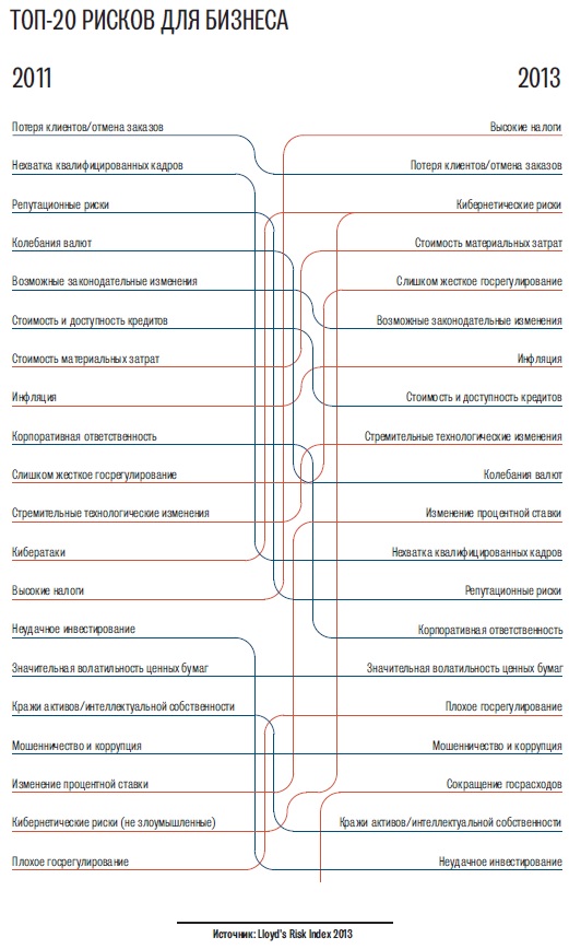 Еще два года назад высокие налоги занимали 13-ю строчку в рейтинге основных рисков для бизнеса, однако к 2013 г. этот вопрос стал даже более приоритетным, чем снижение спроса на продукцию и потеря клиентов. Это следует из очередного отчета британской страховой корпорации Lloyd’s «Lloyd’s Risk Index 2013».