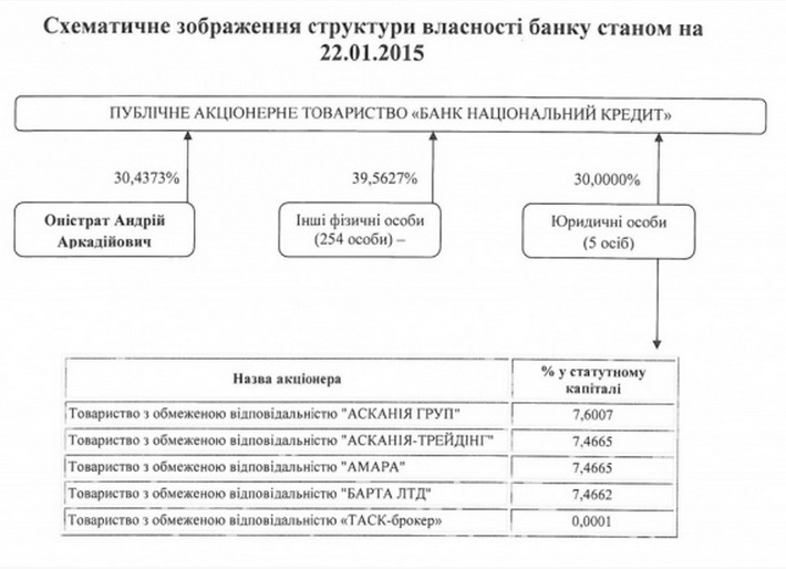 Андрей Онистрат завладел 48,2% его акций, пообещав увеличивать долю. К началу 2011 года он ее довел до 66,7%, но в течение года она упала до 57,1%, а к началу 2013 года — до 53,2%. К 22 января 2015 года, согласно данным НБУ, Андрей Онистрат уменьшил свою долю уже до 30,4%. Больше у банка нет владельцев свыше 10% акций, хотя еще на 1 апреля 2014 года 16,1% акций банка Нацкредит принадлежали Игорю Бобневу — бизнес-партнеру по девелоперскому бизнесу.
