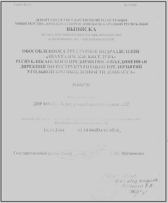 Примечательно, что вместе с украинской регистрацией, «Шахта им. Киселева» имеет регистрацию, выданную органами ДНР. Об этом в своем Facebook сообщил бывший коммерческий директор ГП «Торезантрацит» Виталий Кропачев.