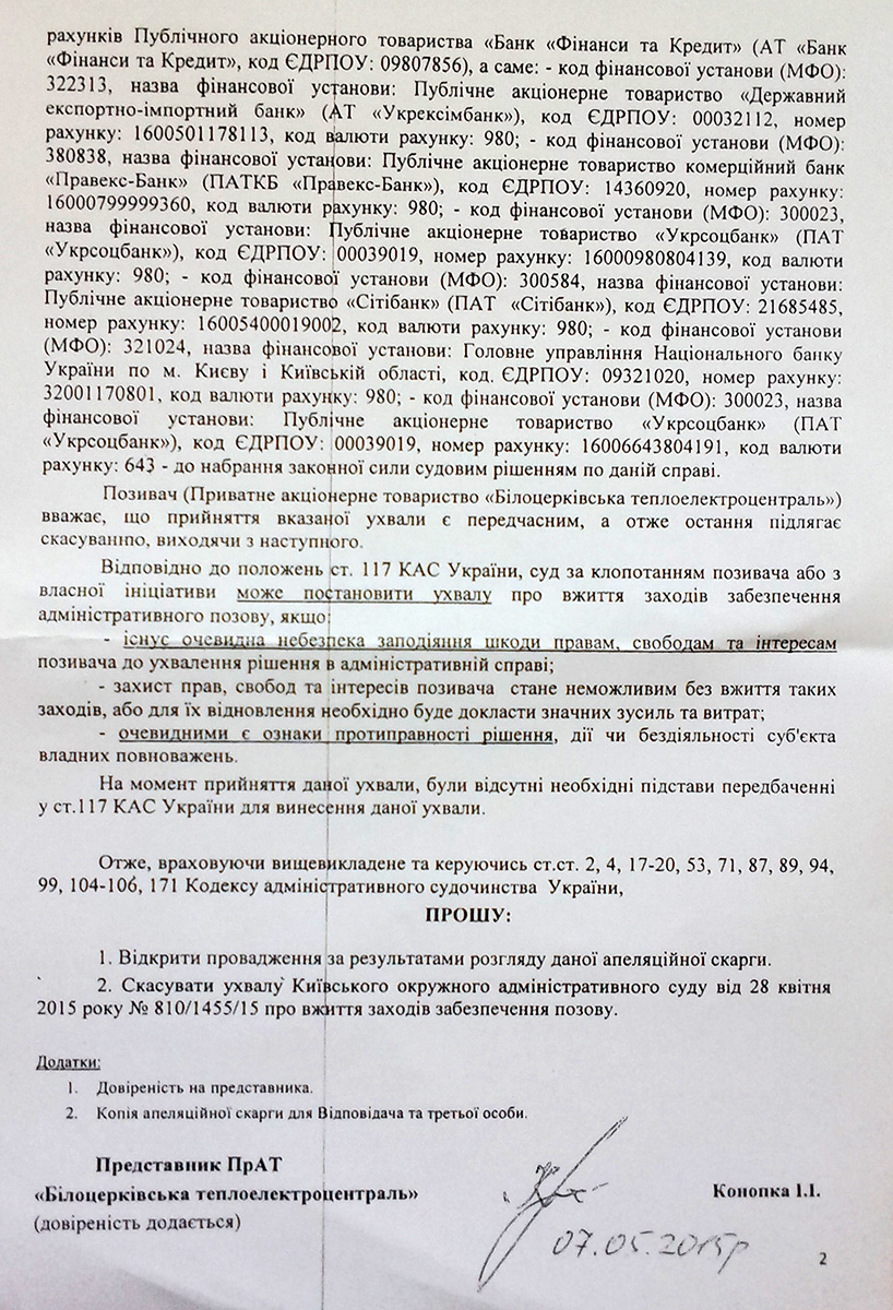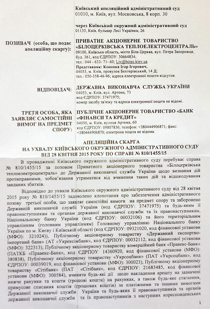 В своем иске Белоцерковская ТЭЦ — напомним сразу, что данный объект принадлежит Константину Жеваго — требует признания противоправными действий по наложению ареста и по исполнению ареста средств банка «Финансы и кредит».