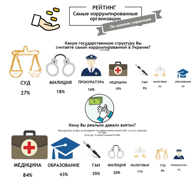 При этом за прошлый год украинцы чаще давали взятки в медицинских учреждениях. На эту сферу припадало 84% взяток опрошенных, тогда как суд и прокуратура являются, согласно опросу, наименее распространенными структурами для дачи взяток (8% и 7% соответственно).