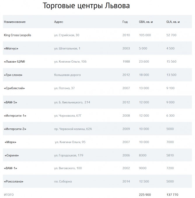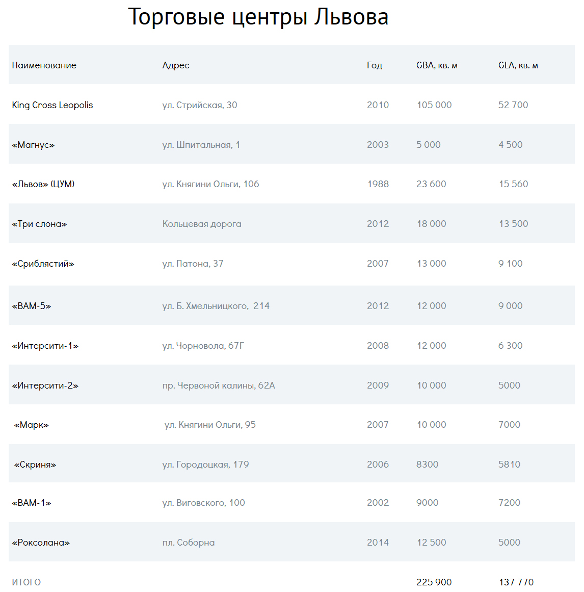 В целом, по данным управляющего директора компании Jones Lang LaSalle в Украине Дмитрия Сенниченко, общий объем качественных торговых площадей Львова составляет около 92,4 тыс. кв. м, или 122 кв. м на 1 тыс. жителей, в то время как аналогичный показатель по Киеву более чем в два раза выше — около 272 кв. м на 1 тыс. жителей.