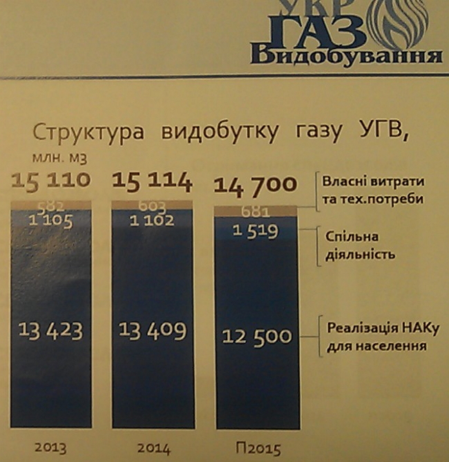 Согласно информации «Укргаздобычи», в этом году ее добыча существенно снизилась. Зато увеличилась добыча газа по договорам о совместной деятельности (СД) с 1,1 млрд кубов в 2014 до прогнозируемых 1,5 млрд кубов в 2015.