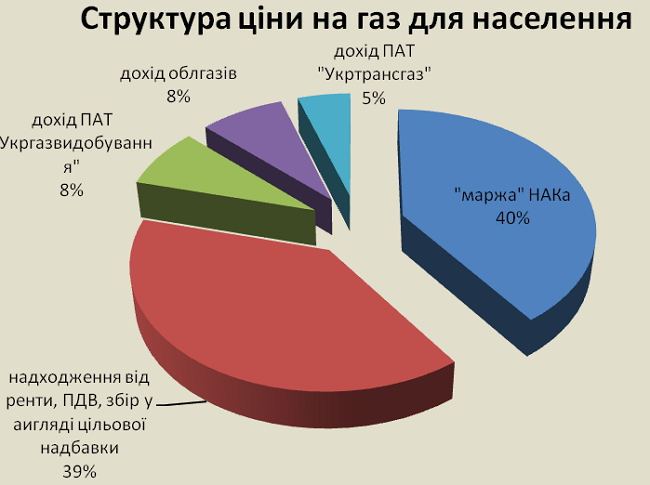 Газ для населения «Нафтогаз» покупает у «Укргаздобычи» по цене, установленной НКРЭКУ — 1590 грн. за тысячу кубометров без НДС. Парламентская рабочая группа считает, что доход НАКа («маржа») от реализации газа составляет 40% в цене газа для населения.