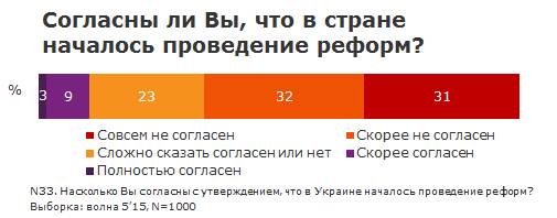 Возможно, такие сроки введения безвизового режима, связаны с тем, что украинцы не ощущают проведения реформ в стране, от которых также зависит решение ЕС. Всего 12% опрошенных согласны с тем, что в стране проводятся реформы, а 63% скорее или совсем не согласны.