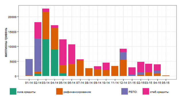 Если распределить все выданные Нацбанком кредиты на временной шкале, в первую очередь бросается в глаза падение объемов кредитной поддержки банков, начиная со второй половины 2014-го года. Более того, изменилась структура кредитов: в 2015 году существенно сократилась доля кредитов рефинансирования по сравнению с целевыми стабилизационными кредитами, направленными на обеспечение интересов вкладчиков проблемных банков. Всего за 5 месяцев в 2015 году Нацбанк выдал только 16 млрд гривен кредитов сроком более 30 дней, что на порядок меньше, чем 115,6 млрд, выданных в 2014 году.