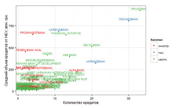 Банки с мажоритарным иностранным капиталом получили менее 8% от общего кредитного пирога. При этом из 10 млрд гривен кредитов, предоставленных иностранным банкам, 3,5 млрд освоил Альфа-Банк, 2,6 – Проминвестбанк, 0,9 – Райффайзен Банк Аваль, 0,7 – Unicredit Bank. Российский Проминвестбанк также оказался лидером среди иностранных банков по среднему объему кредита от НБУ, тогда как Альфа-Банк – по количеству полученных займов.