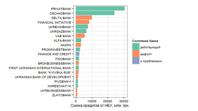 По нашим расчетам, в течение 17 месяцев банковского кризиса, начиная с 1 января 2014 года официально неплатежеспособные банки получили 28,8% (38 млрд гривен) от всего кредитного пирога НБУ. Крупнейшими заемщиками были Дельта Банк (10,1 млрд гривен), «Финансовая инициатива» (8,4), VAB Банк (5,5), «Надра» (3,3), Брокбизнесбанк (2).