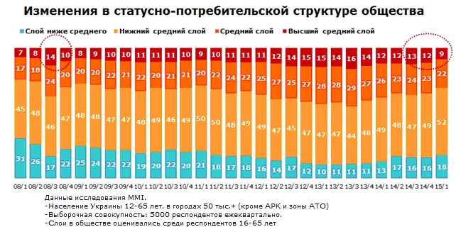 Начиная с 4 квартала 2013 года, в Украине доминирует тенденция сокращения высшего среднего слоя (так называемого среднего класса) и класса, наиболее близкого к нему (среднего слоя). В то же время прирастает доля более низких слоев. В середине 2014 года тенденция сокращения среднего класса немного замедлилась, однако в конце 2014 возобновилась и в начале текущего года достигла рекордно низкого значения за последние 4 года — 9%.