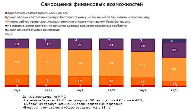 Если в 4 квартале 2013 года всего 1% населения не хватало денег даже на еду, то в 1 квартале 2015 года эта цифра увеличилась до 6%. При этом в 2 раза сократилось количество респондентов, которым хватает денег на покупку бытовой техники, но не хватило бы на автомобиль — с 22% до 11%.