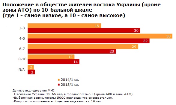 Восточный регион стал единственным регионом Украины, где за последний год немного выросло количество людей, оценивающих свое положение как высокое (на 2%). Но одновременно с этим Восток показывает наибольший рост (на 11%) низкой самооценки в обществе.