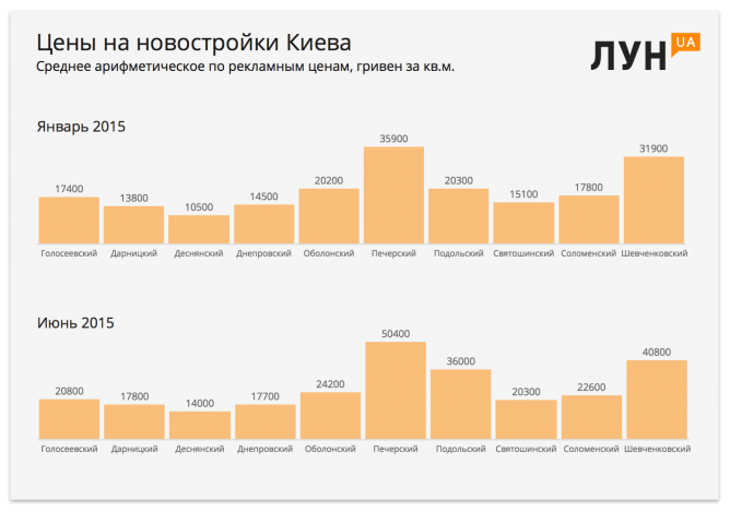 С начала года средняя цена на первичную недвижимость в Киеве выросла в гривне на 30%. По данным специализированного портала ЛУН.ua, средняя цена квадратного метра в эконом-кассе составляет 17,5 тыс. грн, в комфорт-классе — 18,8 тыс. грн, в бизнес-классе — 27,6 тыс. грн, а в элитном сегменте — 75,2 тыс. грн.