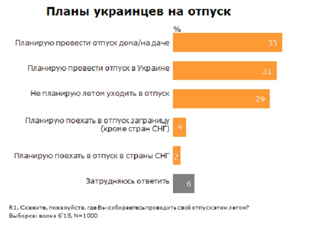 Согласно исследованию TNS On-line Track за июнь 2015 года, 64% украинцев планируют провести отпуск в пределах Украины или на собственной даче. Всего 6% украинцев планируют выезжать за границу — 2% намерены провести отпуск в странах СНГ, 4% — выехать за границы СНГ.