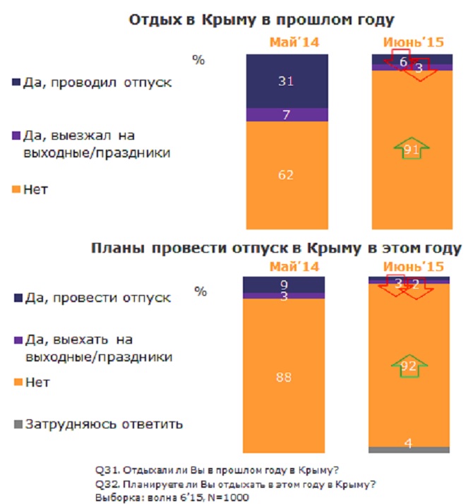 В связи с аннексией Крыма, он практически исчез с туристической карты украинцев. По сравнению с маем 2014 года значительно упала доля тех, кто отдыхал или планирует провести отдых в Крыму. Больше 90% опрошенных не отдыхали в Крыму в прошлом году и не планируют ехать в Крым в этом году. Тогда как в 2013 проводили отпуск в Крыму 31% украинцев и еще 7% выезжали на выходные или праздники в Крым.