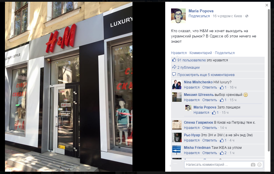 Например, в Одессе работают торговые точки H&М и IKEA. Такие магазины встречаются не только в Одессе, но и в Киеве. А в Харькове пару лет назад на крупнейшем украинском рынке «Барабашова» работал «фирменный магазин» Hugo Boss.