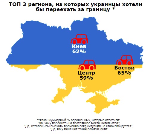 В Киеве самый большой процент опрошенных, которые хотели бы переехать заграницу на постоянное место жительства — 20%, по сравнению с остальными регионами.