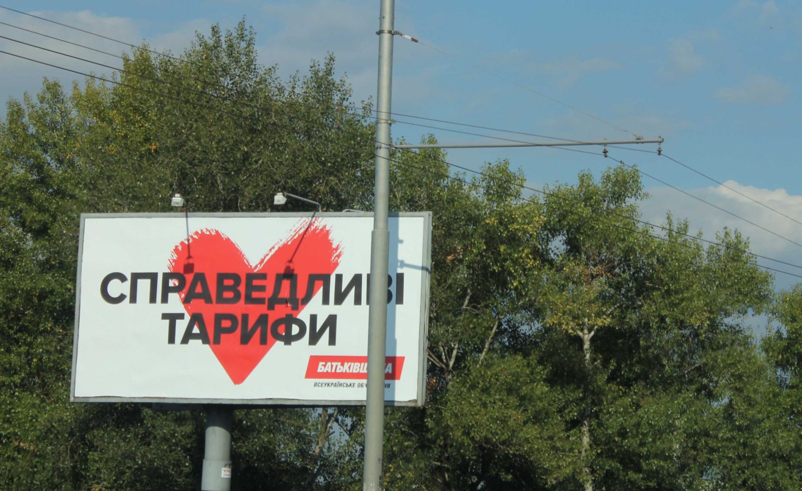 Партия «Батькивщина» в своей киевской кампании использовала свой главный «торговый знак» — стилизованное сердечко, разросшееся до масштабов всего борда и главную «торговую марку» — «Справедливость», которая из абстрактного понятия превратилась в вполне конкретное прилагательное. К «зарплатам», «пенсиям», «тарифам».