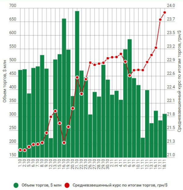 И хотя НБУ заявлял о свободном гибком рыночном курсообразовании, именно жесткие административные ограничения многие месяцы удерживали курс в границах коридора 21-23 грн/доллар. Кстати, хотя официально никакого «коридора» не существует, НБУ публично признавал, что считает оправданным колебания курса именно в таком диапазоне. Еще в начале ноября курс вышел за пределы «коридора» и, не почувствовав сопротивления НБУ, устремился вверх. 2 ноября НБУ продал $30 млн по 23,01 грн, после чего две недели не продавал валюту на аукционе. 17 ноября ему удалось продать всего $5,3 млн по 23,67 грн из-за небольшого спроса, а 18 ноября НБУ хоть и повысил объем продаж на аукционе до $13,1 млн (курс — 23,87 грн/доллар), но обещал продать намного больше — $50 млн.
