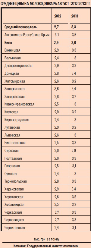 Лидерам по дороговизне являются Киев (тонна молока продается в столице за 3,54 тыс. грн), Херсонская область (здесь она стоит 3,53 тыс. грн) и Крым (3,48 грн). Впрочем, подорожало молоко не во всех регионах — так, в Закарпатье оно подешевело почти на 7 %.