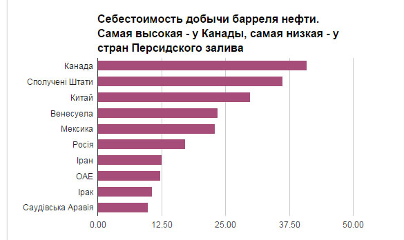 Сейчас наступил период, когда страны — добытчики нефти — одна за другой уходят в «минус». В этом плане позиции России — не самые худшие, но и не самые лучшие. Как видно на графике, себестоимость в РФ находится в районе 17 долларов за баррель. Это данные Ucube database на 2015 год.