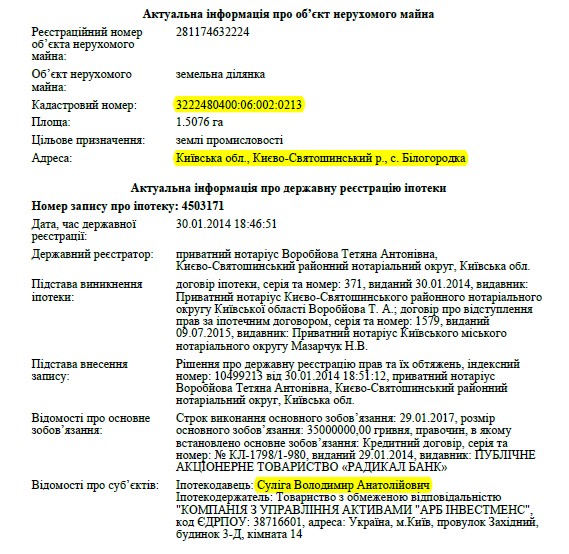 За время пребывания Якубовича в должности ГПЗКУ тоже пользовалась услугами банка. Кроме того, документы позволяют предположить, что некоторые уступленные «АРБ инвестменс» кредиты могли быть записаны на сотрудников «Радикал Банка». Например, в реестре прав на недвижимое имущество можно найти информацию, что кредиты на 35 млн грн под залог земельных участков в Киевской области были выданы Владимиру Анатольевичу Сулиге и Александру Олеговичу Нечипоренко.